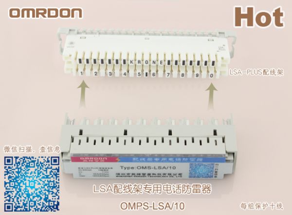 歐姆雷盾(OMRDON)OMS-LSA/10配線架專用電話防雷器主要用于通信系統程控電話交換機內外線、集團電話等設備提供線/線間及線/地間的浪涌過電壓保護,直接插入KRONE( 科龍)LSA-PLUS配線架上,每組10線保護;特別適用于模擬電話交換和ISDN網絡系統。應用于用于雷擊區域LPZ0- LPZ1分區界面。