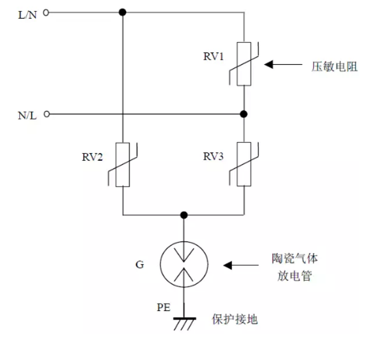 2.缺點:壓敏電阻RV1 短路失效后易引起火災(zāi)。最好在每個壓敏電阻上串聯(lián)一個工頻保險絲以防壓敏電阻短路起火。如果L、N 線不可能接反,則可省去壓敏電阻RV2、RV3,將放電管G 的上端直接接到N 線上,構(gòu)成“1+1”電路。