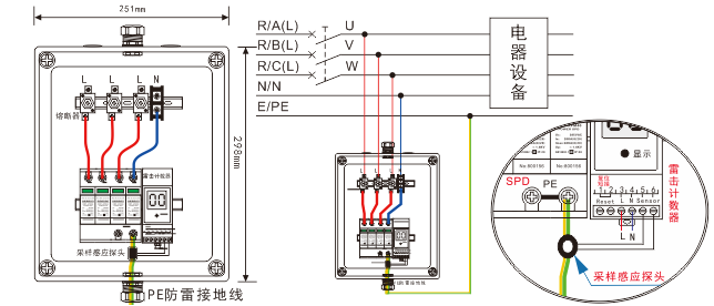 2、連接導線必須采用多股銅芯導線,導線截面積必須符合工程安裝要求。安裝時注意L線接防雷箱熔斷器L接線端子,N線接熔斷器N線端子,PE地線接防雷器的PE接地端子,不能接反或漏接。