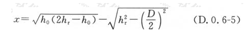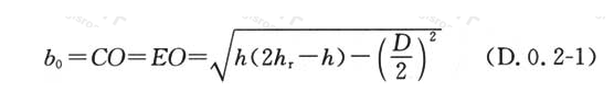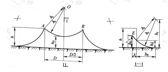 4)接閃線兩端的保護范圍按兩支接閃桿的方法確定,但在中線上h0線的內移位置按以下方法確定(圖D.0.6-1中1-1剖面):以兩支接閃桿所確定的保護范圍中最低點的高度作為假想接閃桿,將其保護范圍的延長弧線與h0線交于E點。內移位置的距離也可按下式計算:
