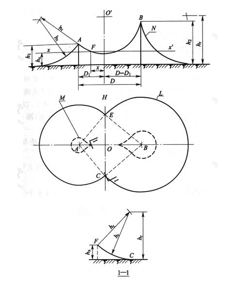 為半徑作圓或弧線,與各兩支接閃桿在外側所作的保護范圍載面組成該保護范圍截面(圖D.0.4中虛線)。