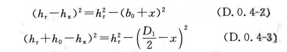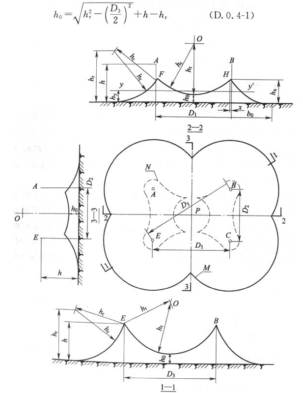 D.0.4 矩形布置的四支等高接閃桿的保護范圍,在h小于或等于hr的情況下,當D3大于或等于