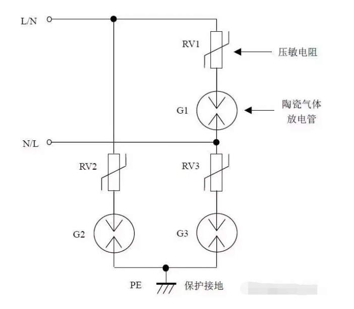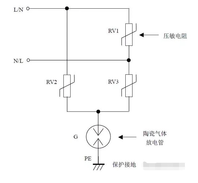 缺點:壓敏電阻RV1短路失效后易引起火災。最好在每個壓敏電阻上串聯一個工頻保險絲以防壓敏電阻短路起火。如果L、N線不可能接反,則可省去壓敏電阻RV2、RV3,將放電管G的上端直接接到N線上,構成“1+1”電路。