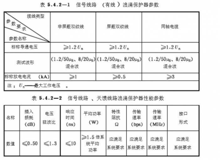 2.電子信息系統信號線路浪涌保擴器的選擇,應根據線路的工作頻率,傳輸介質,傳輸速率,傳輸寬帶,工作電壓,接口形式,特性阻抗等參數,選用電壓駐波比和插入損耗小的適配的浪涌保護器.信號線路浪涌保護器參數應符合表5.4.2-1,5.4.2-2的規定