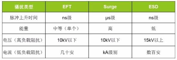 先了解幾種典型的瞬態(tài)騷擾:從表中可知,浪涌的能量最高,過電流最大,因此危害性也是最大。