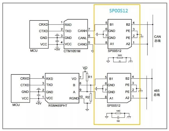 分立元器件方案雖然能夠提供有效的防護(hù),但是需要引入較多的電子器件,這也就意味著接口電路將占用更多的PCB空間,若器件參數(shù)選擇不合適易造成EMC問題。有沒有更簡(jiǎn)潔的防護(hù)設(shè)計(jì)呢?答案是肯定的。可選擇引入專業(yè)的信號(hào)浪涌抑制器SP00S12,可用于各種信號(hào)傳輸系統(tǒng),抑制雷擊、浪涌、過壓等有害信號(hào),對(duì)設(shè)備信號(hào)端口進(jìn)行保護(hù)。搭配ZLG的全隔離CTM或SC系列的隔離CAN收發(fā)器,如下圖。可極大程度的提升產(chǎn)品的集成度,于此同時(shí)極大程度的縮小開發(fā)周期。