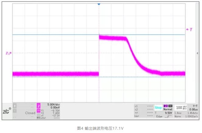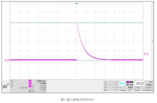 接下來做一下浪涌抗擾度測(cè)試,檢驗(yàn)一下浪涌抑制器是否滿足IEC61000-4-5±4KV防護(hù)要求,以共模浪涌測(cè)試為例,在SP00S12輸入端加載4KV、1.2/50μs浪涌電壓,在輸出端測(cè)試壓降已被降低至17.1V,波形圖如下。
