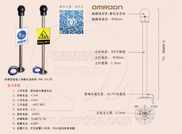 歐姆雷盾(omrdon)OML-EX/SE 智能型防爆(本安型)人體靜電消除球是適用于易燃、易爆及防靜電場所的人體靜電釋放裝置。其特點在于設計合理的人體靜電釋放電阻,合理有效控制人體靜電釋放,延長人體靜電釋放時間,降低瞬間人體靜電釋放能量,能夠使人體靜電安全釋放。同時能檢測人體與靜電觸摸球接觸是否可靠,聲光報警提示靜電消除是否完畢。