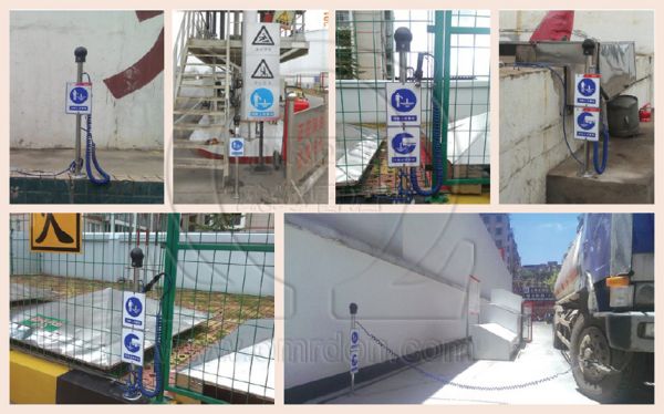 第14.3.13條規定:由于人們穿著人造織物衣服極為普遍,人造織物極易產生靜電,往往積聚在人體上。為防靜電可能產生的火花,需對進入輕油泵房、輕油罐頂上、輕油作業區的操作平臺,以及爆炸危險區域等處的扶梯上或入口處設置消除人體靜電的裝置。此消除靜電裝置是指用金屬管做成的扶手,在進入這些場所之前人體應撫摸此扶手以消除人體靜電。